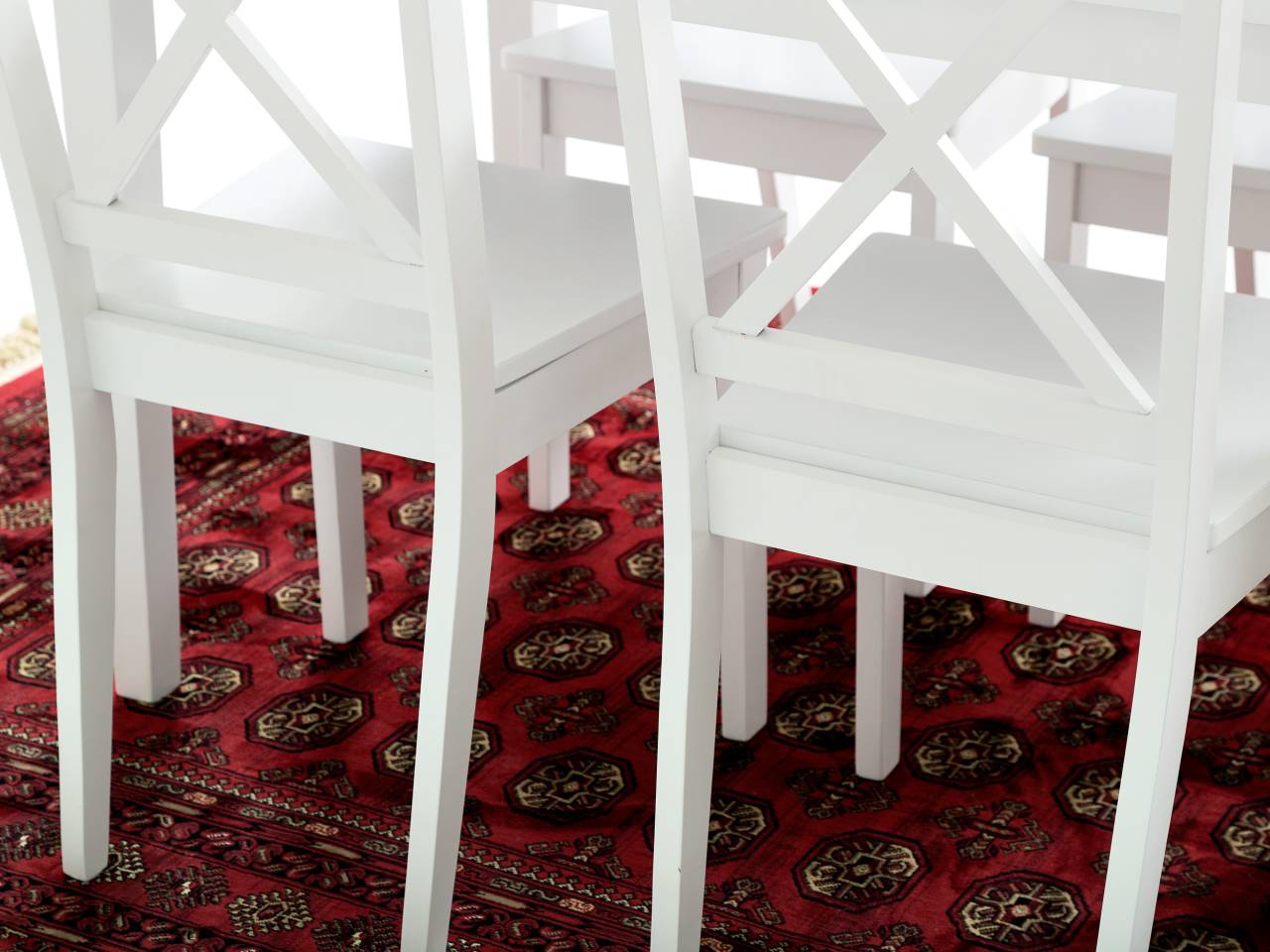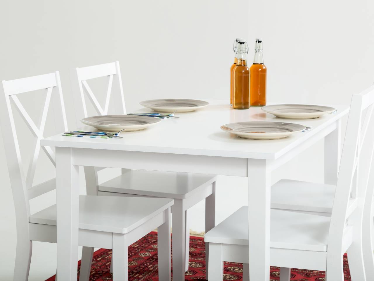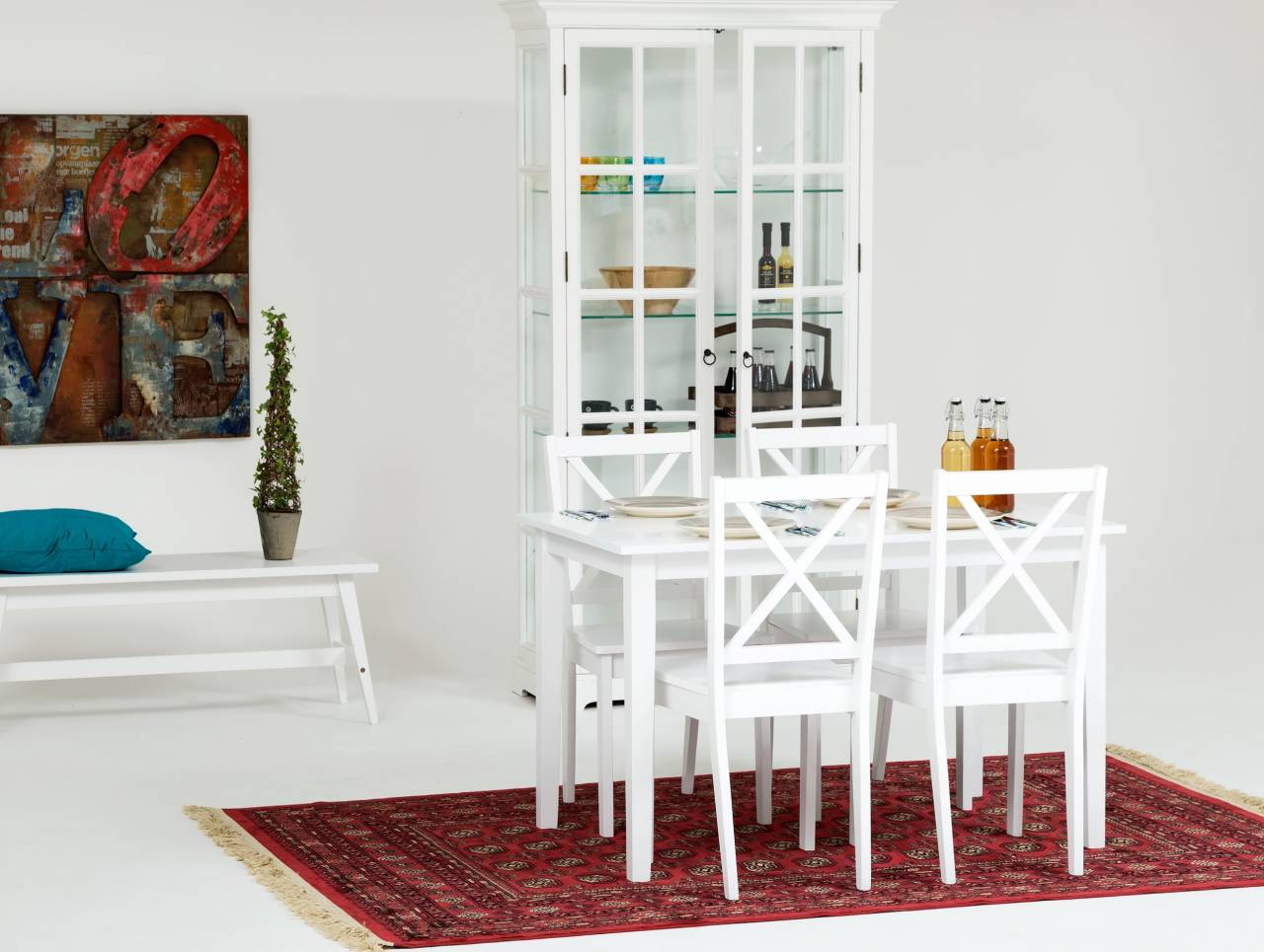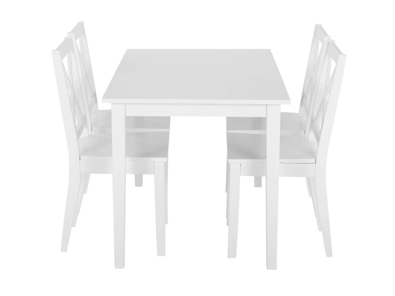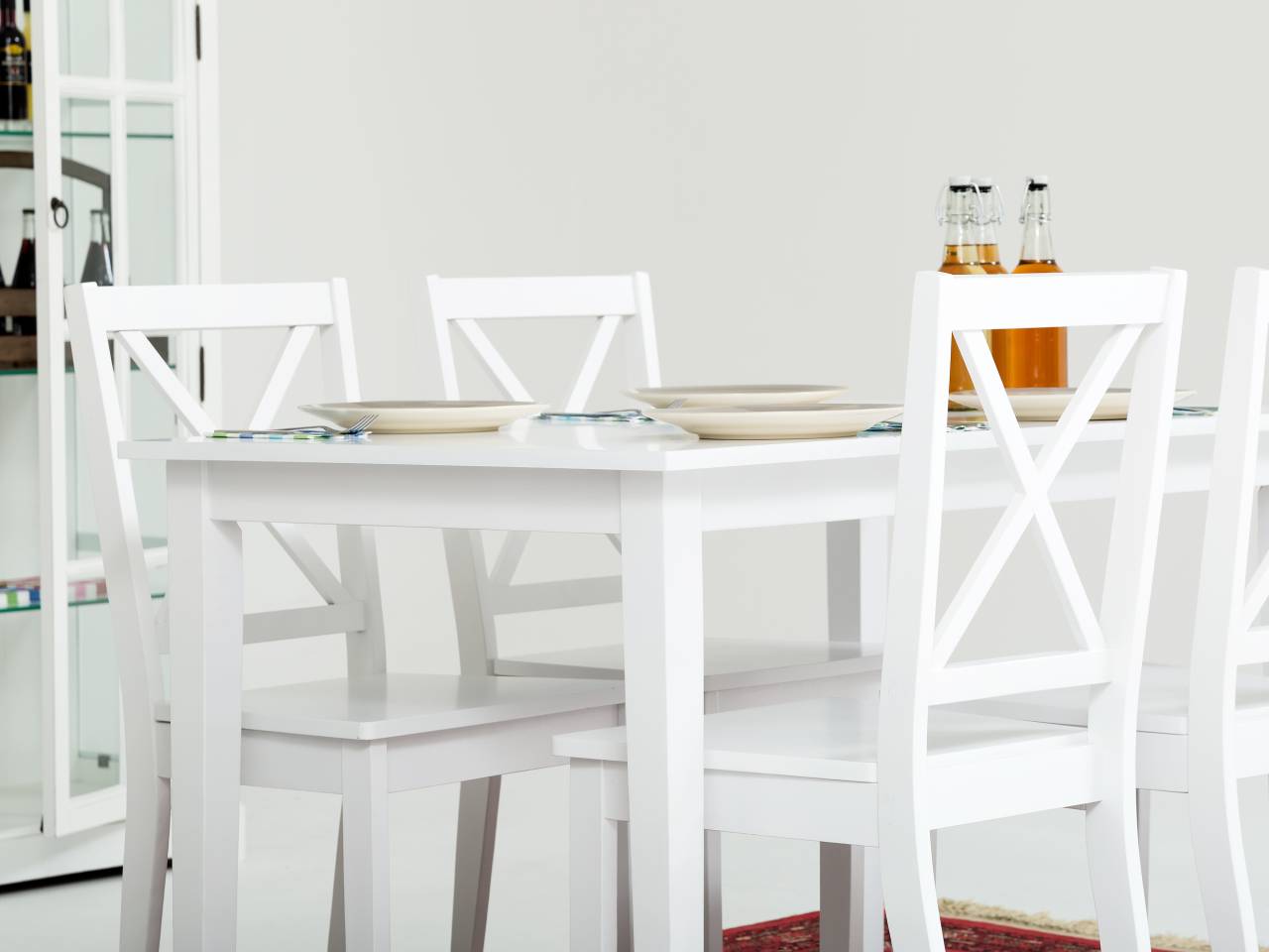 Denna matgrupp som består av ett BARRINGTON bord och fyra stolar är som klippt och skuren för dig som söker ett mindre möblemang för köket eller sommarstugan. Möblernas klassiska formspråk, som påminner om klassisk svensk möbeltradition, och dess fräscha vita uppenbarelse bidrar till en idyllisk och mysig känsla som är svår att ta miste på. Tack vare heletens raka och stilrena kvalitéer passar matgruppen samtidigt utmärkt i det moderna och mer kliniskt inredda hemmiljöerna. Utan tvekan en mycket prisvärd och funktionell möbelgrupp helt enkelt.