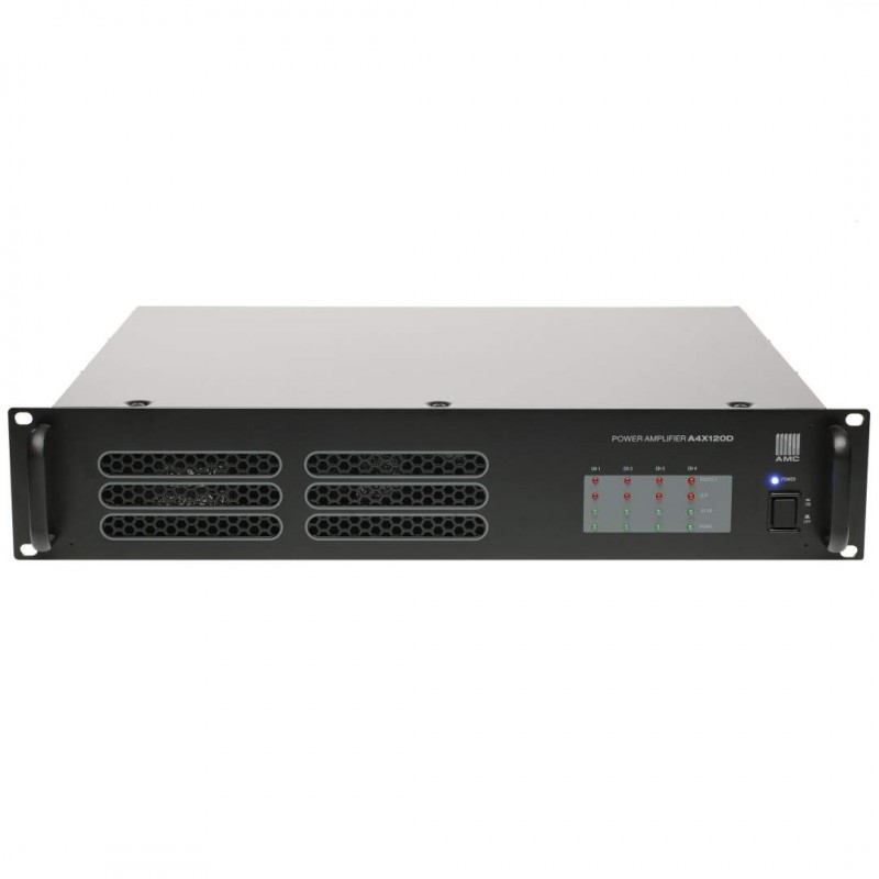 A4X120D high efficiency switching mode power supply D-class amplifier. Robust construction design, high quality components, traditional long lasting performance. All amplifier channels has 120W power, own individual gain control, HPF filter and output transformer. Designed for professional applications in medium and large scale voice evacuation and public address systems.