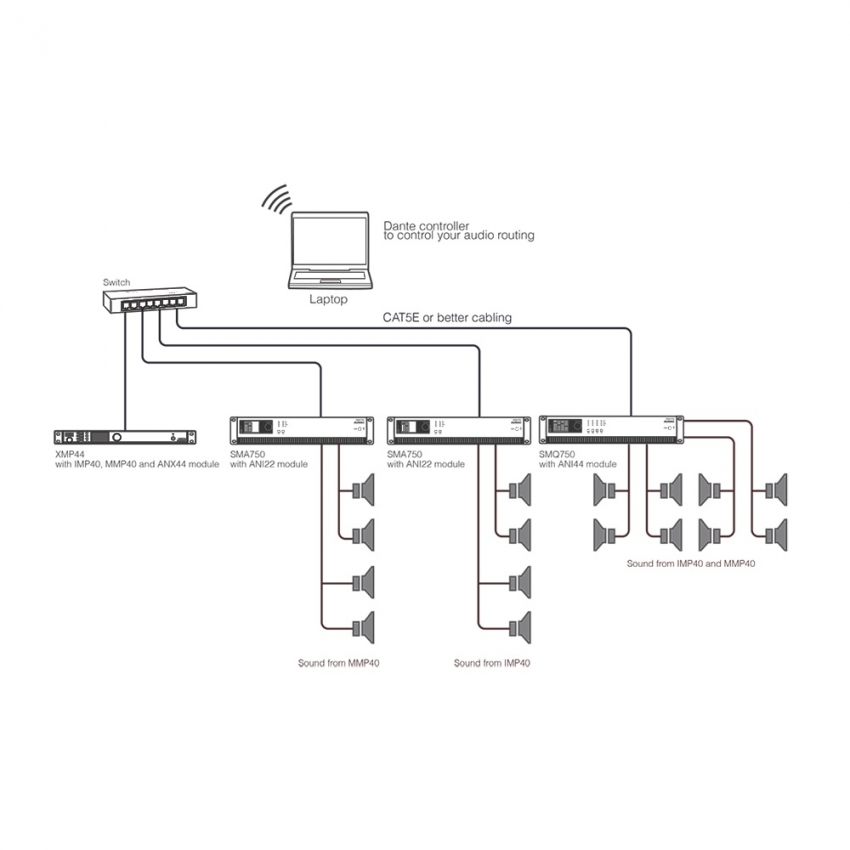 Med insticksmodulen ANI-44 så utökas Audac's slutstegsserie Wavedynamics SMQ- och PMQ- med 4 ingångar och 4 utgångar för Dante Audio nätverk med möjlighet att skicka och ta emot ljud med 48 kHz - 24 bitars överföring med extremt låg latency.