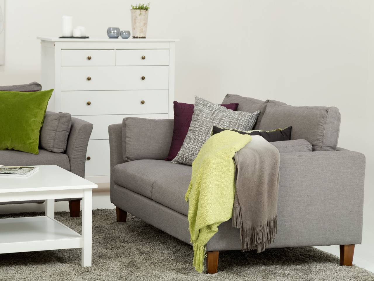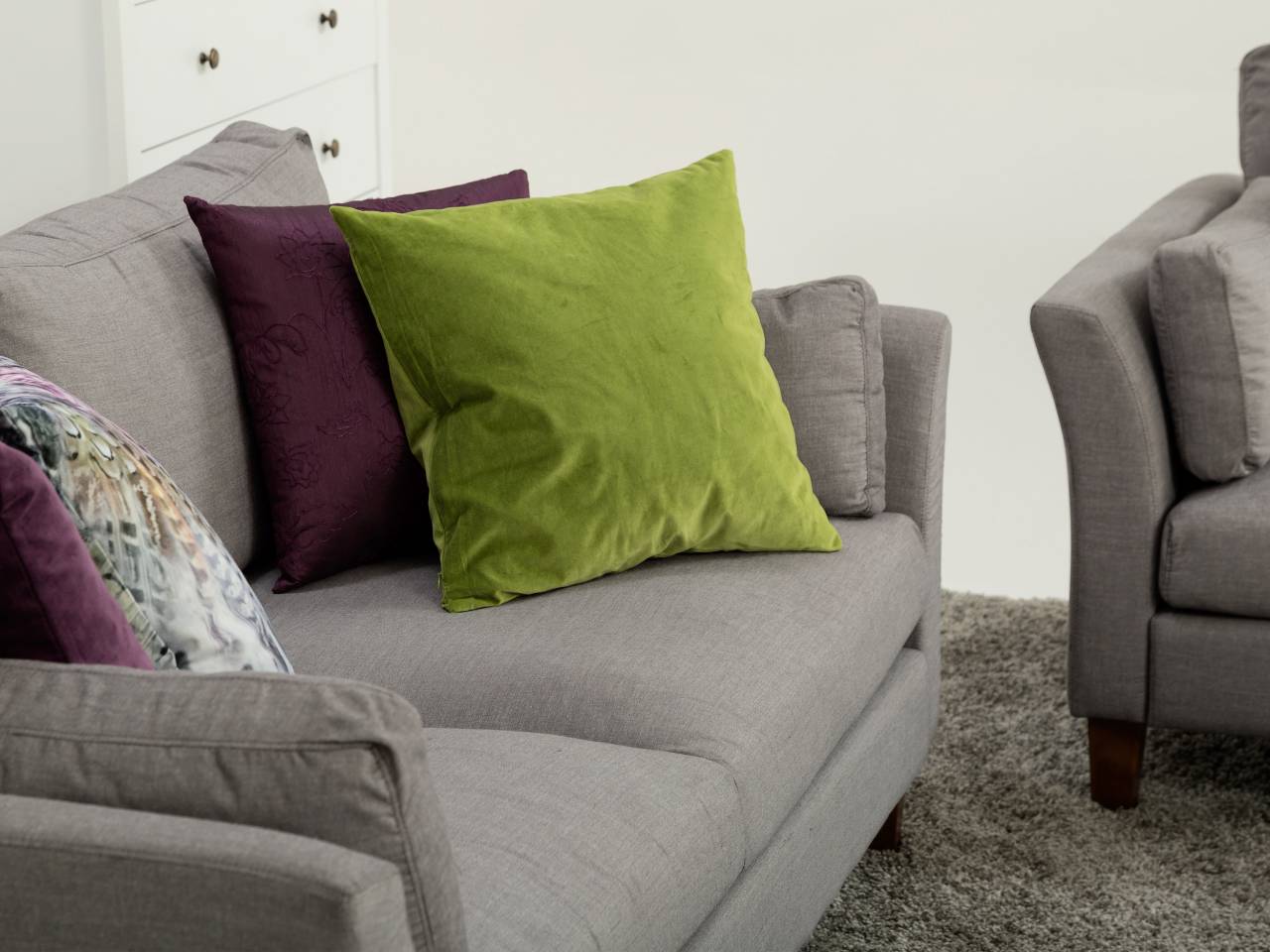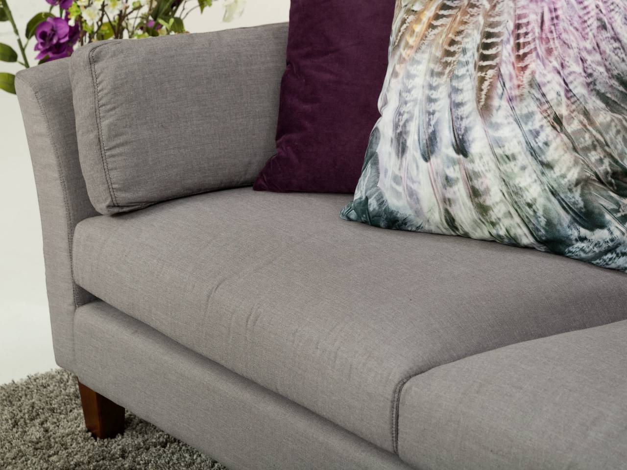 Snygg soffgrupp i grått tyg. En charmig och komfortabel soffgrupp för slott och koja!